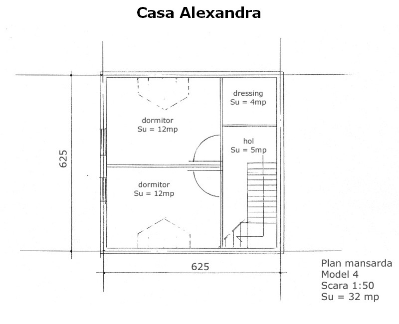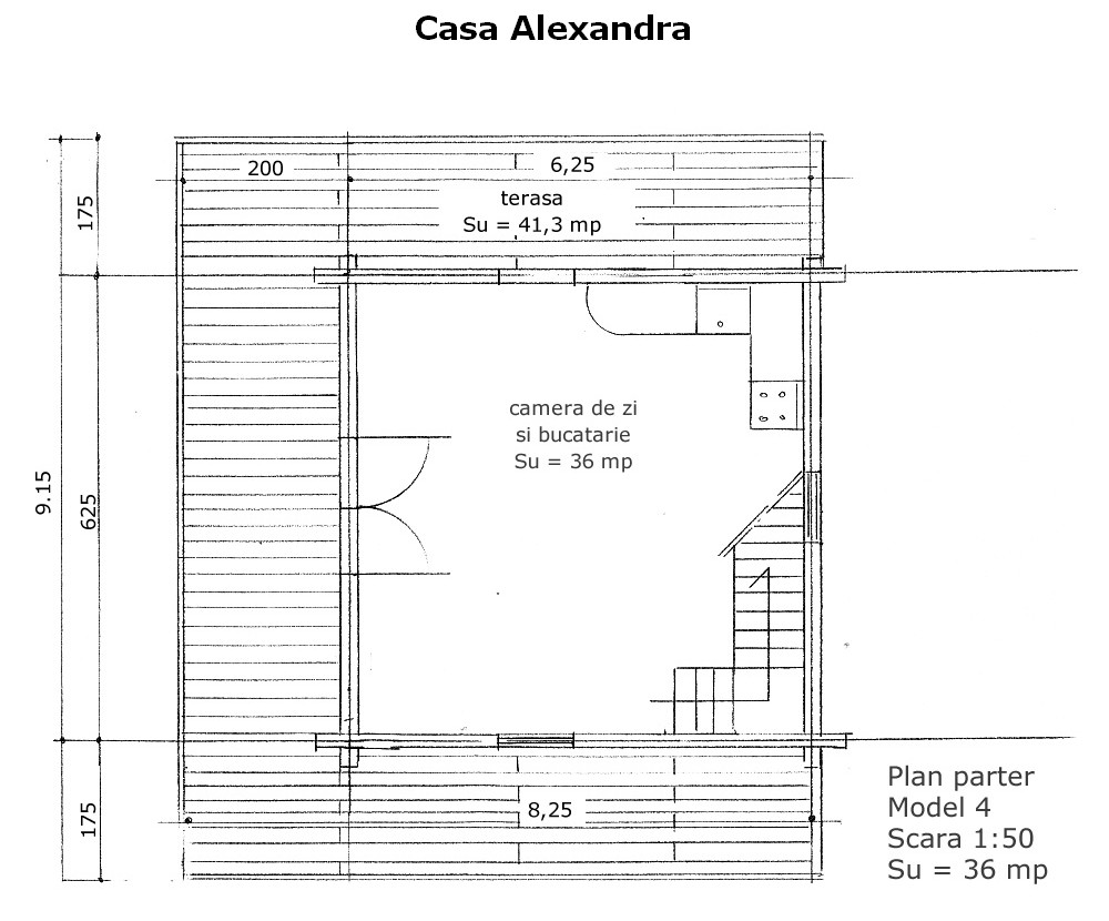 Casa Alexandra este construita pe doua nivele (parter si mansarda). La parter avem o camera de zi si bucatarie de 36mp foarte spatioasa si terasa. La mansarda avem doua dormitoare si un mic dressing.