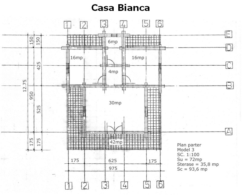 Casa Bianca are o structura clasica de casa de vacanta decomandata cu un hol care leaga doua dormitoare foarte spatioase de 16mp fiecare si o camera de zi de 30mp.